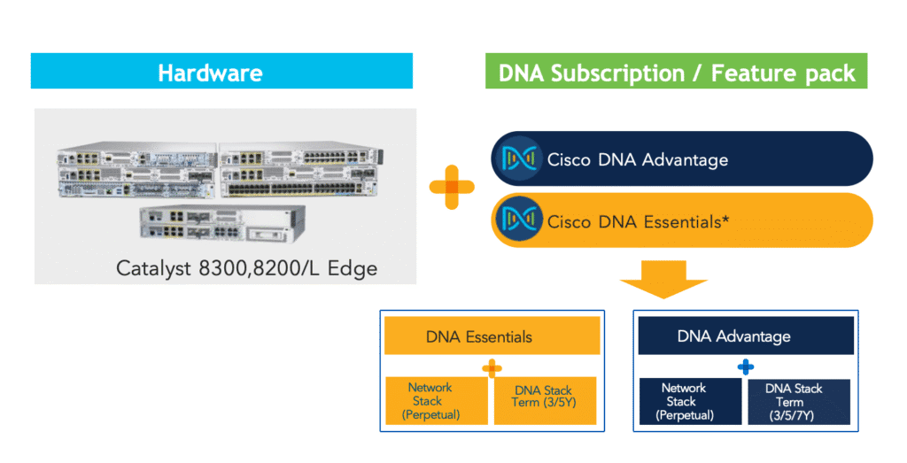 - Cisco DNA Advantage – Advanced security, cloud security integrations, application-aware routing, deeper analytics