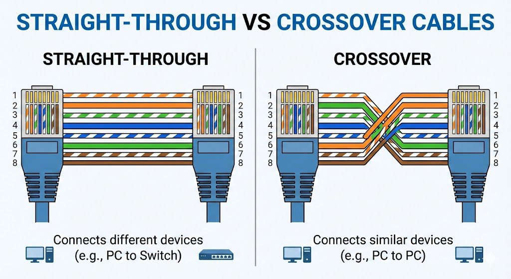 Pro Tip: If you hold the two ends of a cable side-by-side and the color sequence is identical (from left to right), it is a straight-through cable. If the Orange and Green pairs are swapped, it is a crossover.
