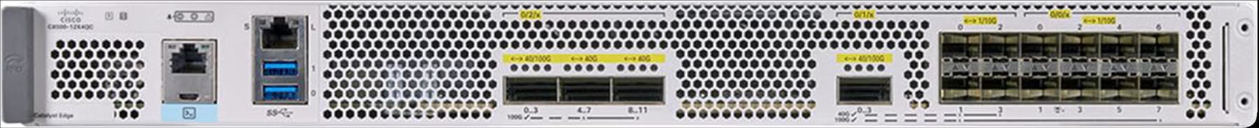 C8500-12X4QC is a Cisco Catalyst 8500 Edge Platform model with 12 × 1/10GE SFP+ and mixed 40/100GE uplinks, purpose-built for SD-WAN aggregation and high-performance encrypted routing. It delivers up to 31.9 Gbps SD-WAN IPsec on IMIX (up to 96 Gbps with 1400-byte packets), and up to 197 Gbps IPv4 forwarding in autonomous mode, scaling to 8000 overlays (10000 per note). With 16 GB default DRAM (upgradeable to 64 GB), 16G/32G eUSB plus optional 480 GB M.2 SATA SSD, dual high-efficiency PSUs, and IOS XE programmability, C8500-12X4QC fits large branch hubs, metro edge POPs, and multi-cloud gateways requiring deterministic, secure throughput and automation at scale.