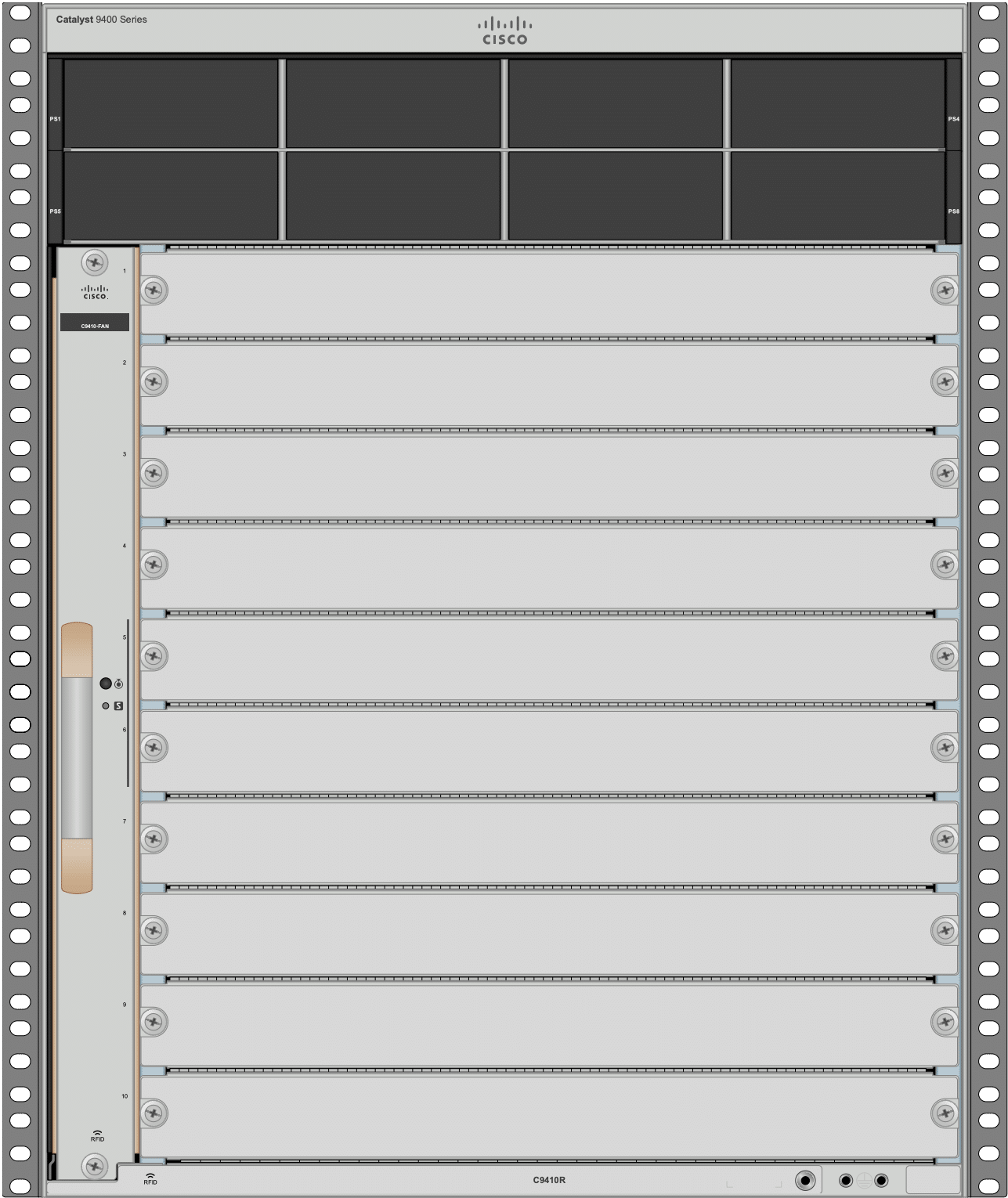 | Model | C9410R | Total slots | 10 (8 line-card, 2 supervisor) |