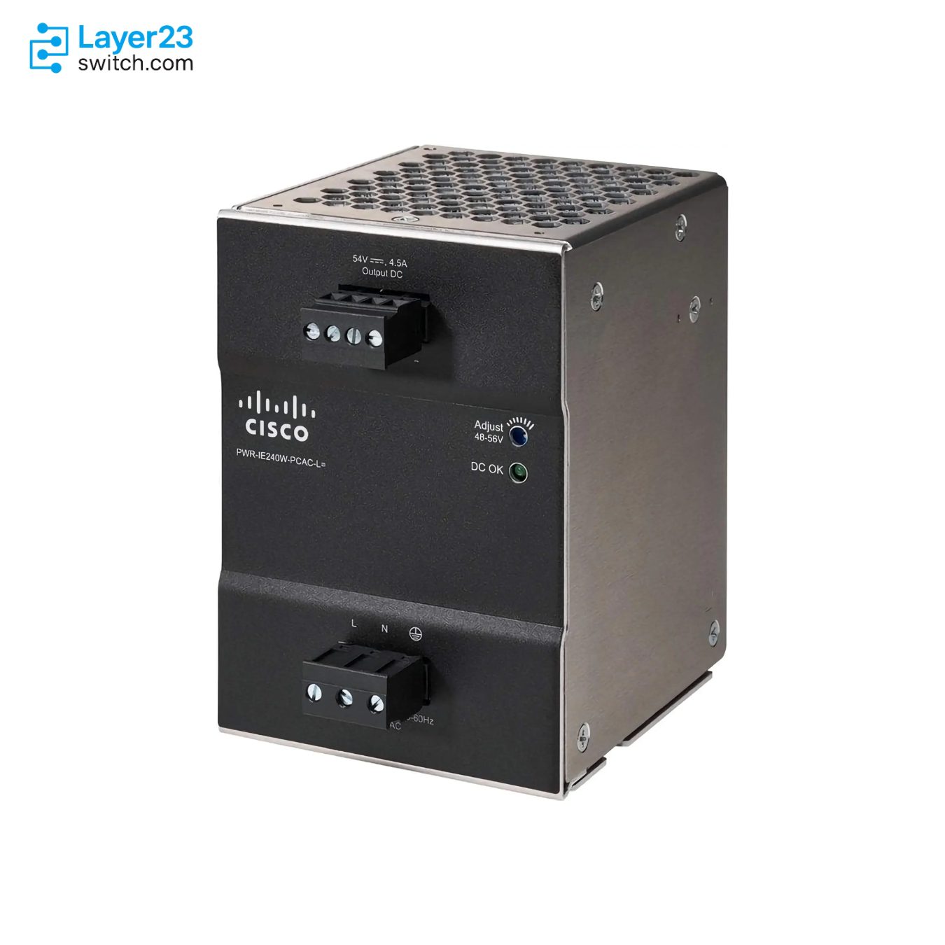 Cisco PWR-IE240W-PCAC-L is a 240W DIN-rail industrial AC power supply that provides 54V DC at 4.5A to support Cisco Catalyst rugged switches and industrial devices with substantial PoE/PoE+ power budgets. With a universal AC input (100–240V, 2.5A, 50/60Hz) and wide range (90–264V AC), it ensures stable performance across industrial environments.The unit offers 91% efficiency, a 20 ms holdup time, and full protection suite (OVP, OCP, OTP, SCP). Operating between −40°C to +80°C (with derating above 40–50°C), the PWR-IE240W-PCAC-L is a compact and lightweight option (85 × 121 × 124.1 mm, 0.96 kg) with an MTBF of 1.58M hours.While it is not approved for hazardous locations, it is ideal for factory automation, transportation, and smart city deployments requiring high PoE budgets for powering multiple cameras, access points, and IoT devices.